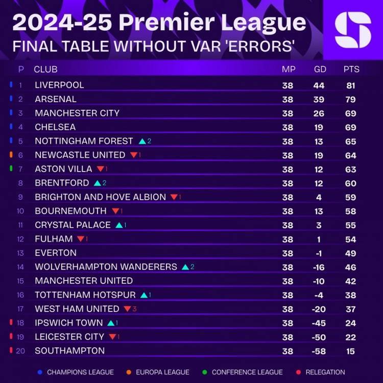 根据投票结果,Squawka列出本赛季英超联赛若无VAR误判情况下的积分榜,利物浦81分夺冠,阿森纳79分次席,曼城第三。诺丁汉森林将参加下赛季欧冠,纽卡踢欧联,维拉踢欧协联。